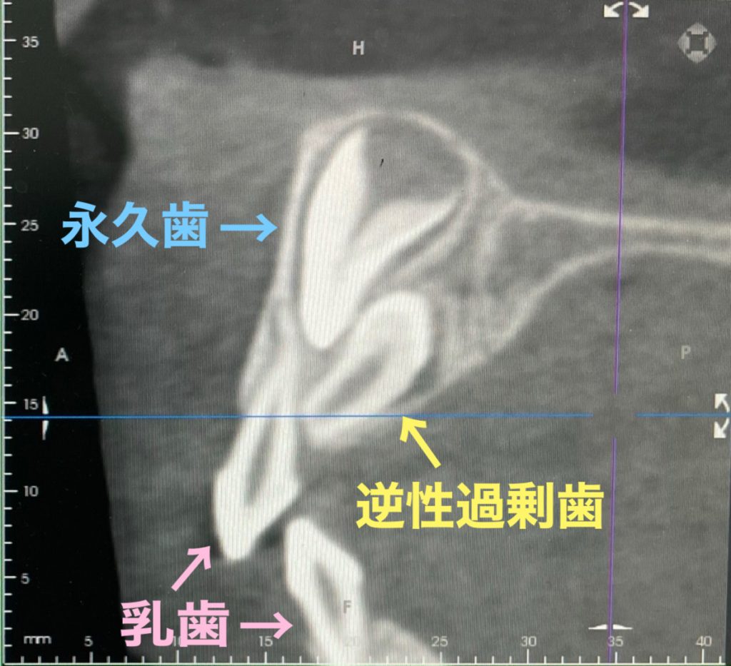 私の息子は4才の時に上の前歯の裏側から過剰歯が生えてきました。CT撮影を行い過剰歯が2本あることが判明!!